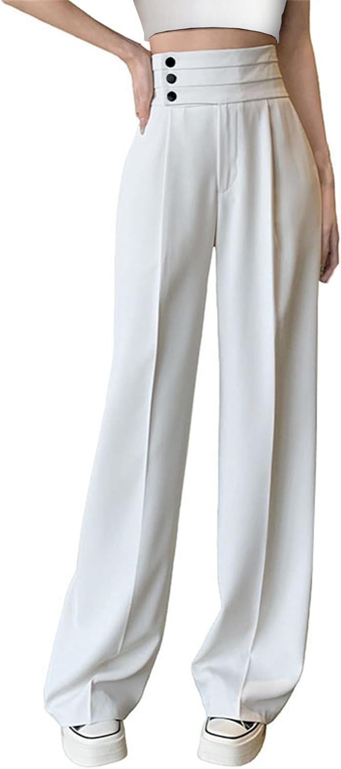 Betusline Women's High Waist Dress Pants Business Side Button Work Wide Leg Pants Straight Leg Trousers, Off-White, Medium