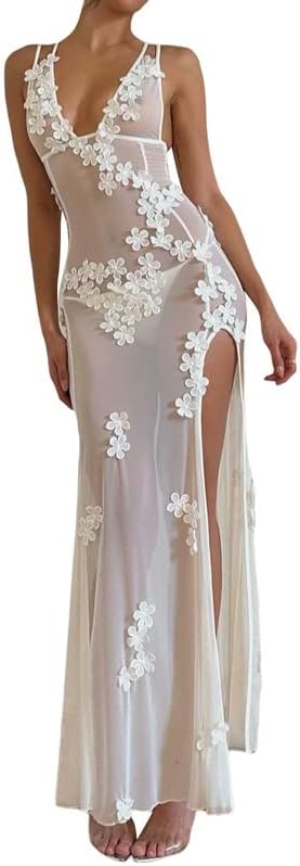 Sexy See Through Sheer Mesh Maxi Dress Sleeveless Lace Patchwork Long Dress Perspective Backless Bodycon Beach Wear