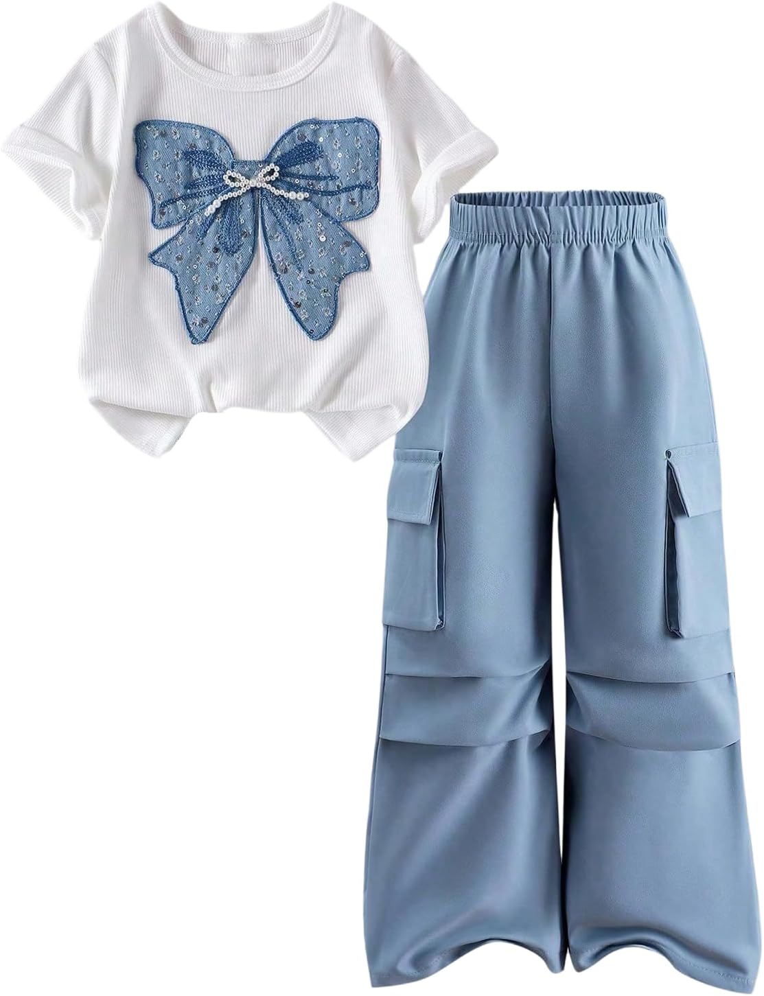 MakeMeChic Girl's 2 Piece Fall Outfits Sequin Bow Knot Crew Neck Short Sleeve Tee and Cargo Pants Clothing Sets