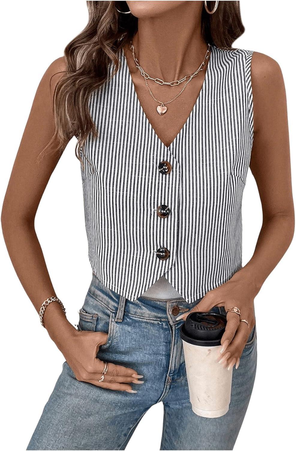 GORGLITTER Women's Striped V Neck Vest Top Sleeveless Cropped Vest Button Down Fashion Casual Dressy Tops