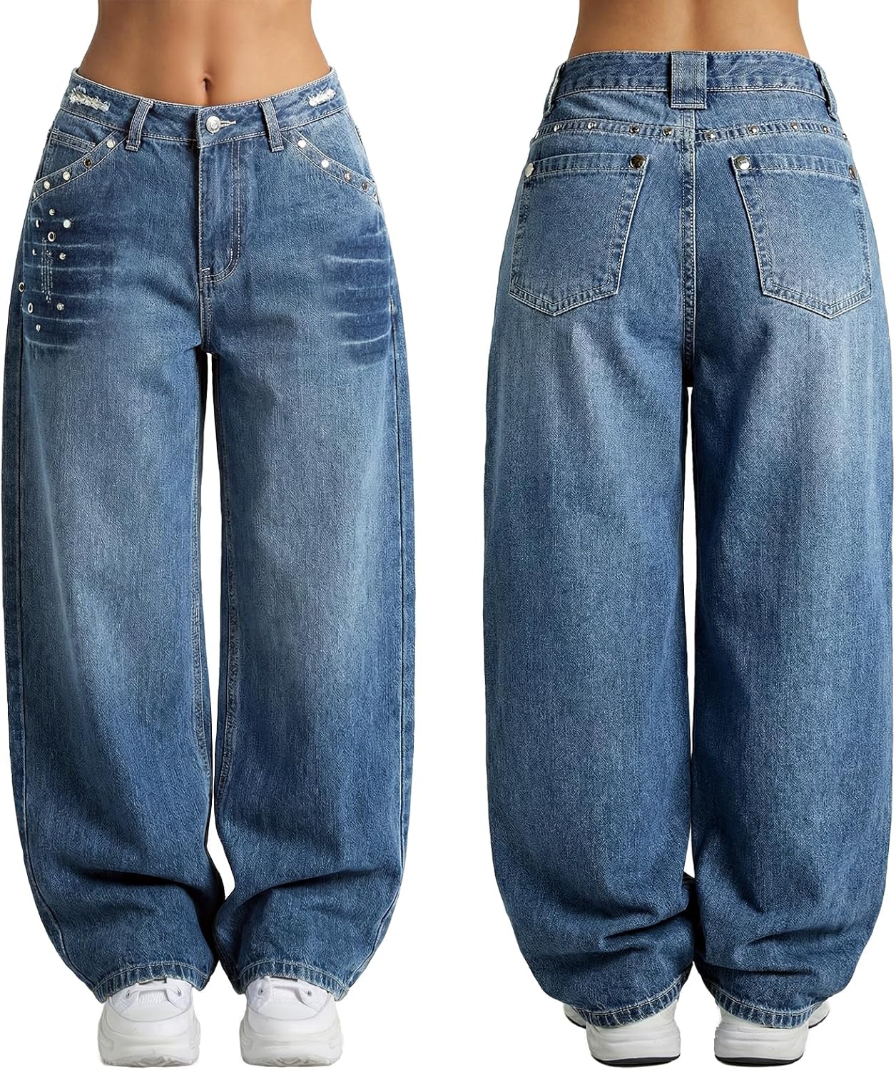 EMMIOL 2026 Women’s Mid High Waisted Wide Leg Jeans Rivet Y2K Baggy Jeans Trendy Loose Straight Denim Pants with Pockets