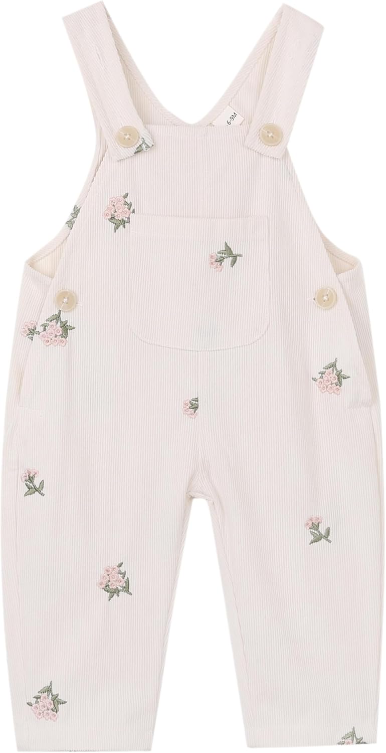 Baby Girl Overalls Corduroy with Floral Embroidery,Beige Toddler Jumpsuit Romper,Soft Overall for Girls (6 Months-3T)
