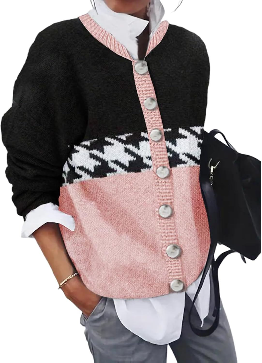 Women's Knit Cardigan Houndstooth Print Long Sleeve Sweater Color Block Button Down Open Front Loose Outwear Coat