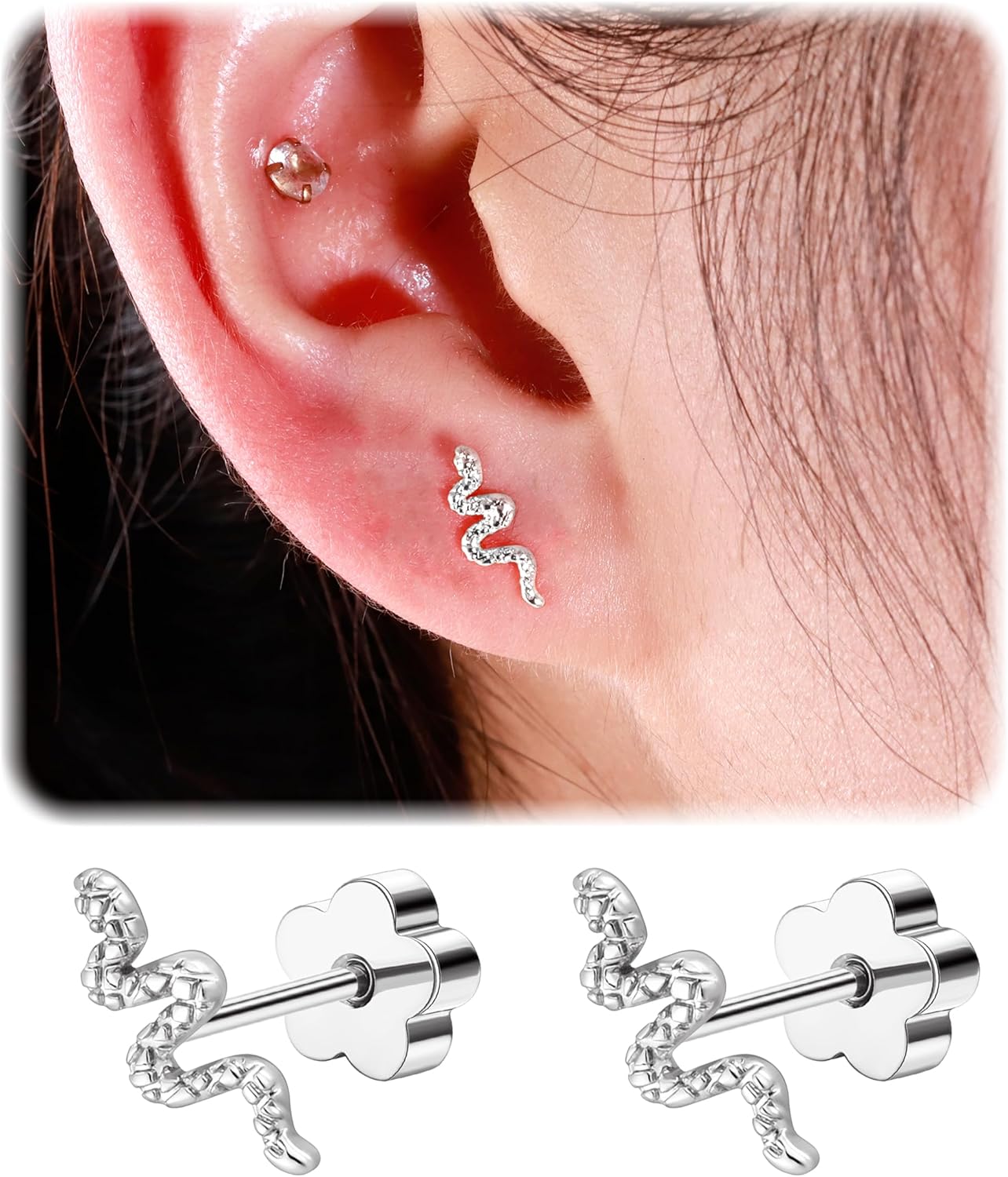 Flat Back Stud Earrings for Girls Women 14K Gold Plated Cartilage Stud Earrings 20G Hypoallergenic Surgical Steel CZ Snake Flower Butterfly Screw Back Nap Earrings Studs