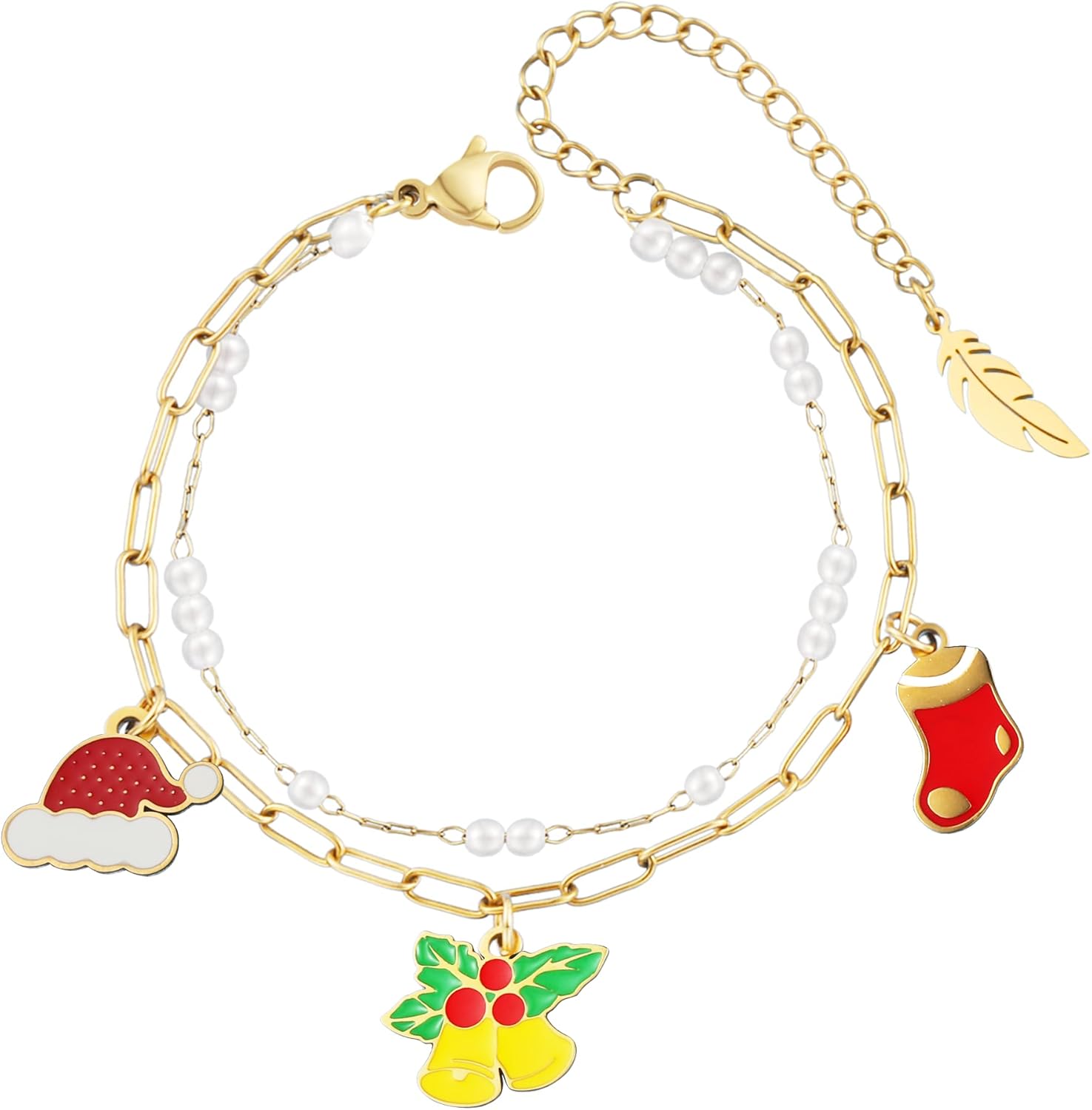 LETFLY Christmas Bracelets for Women, 18K Gold Plated Santa Claus Snowman Christmas Tree Bell Stocking Charms, Stackable Beaded Bracelet Jewelry Gifts for Women