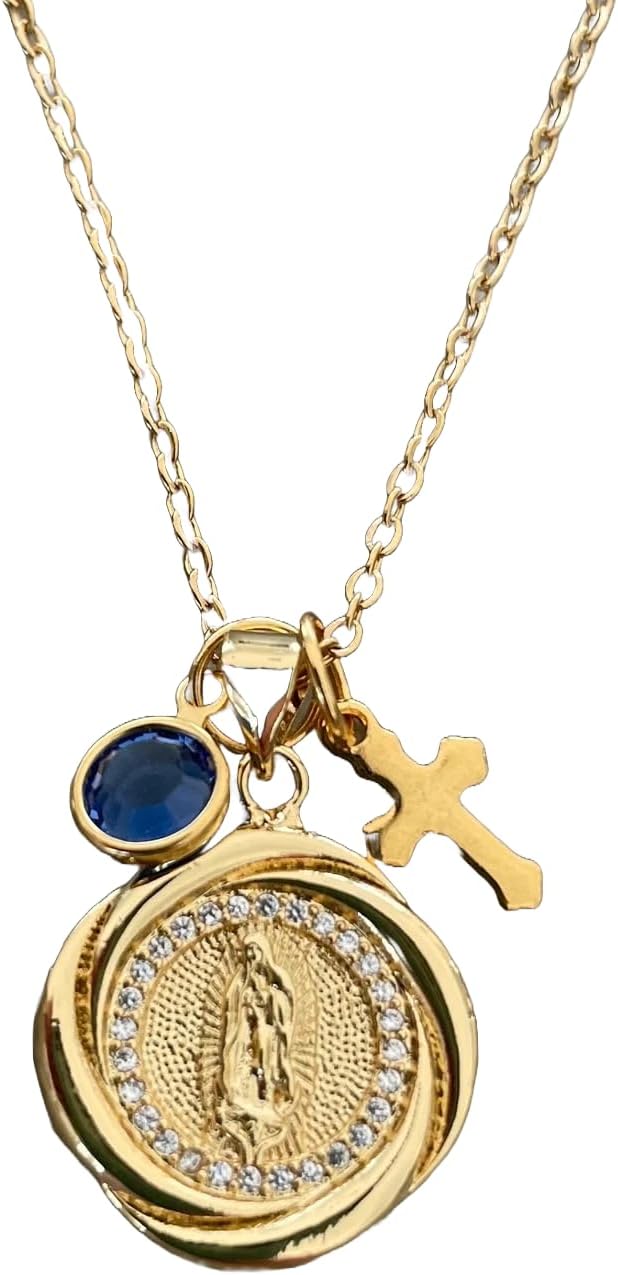 Personalized Virgin Mary Necklace – 14k Gold Filled Catholic Medal Pendant with Birthstone & Cross Charm – Blessed Mother Mary Jewelry – Baptism, Confirmation, Communion Gift