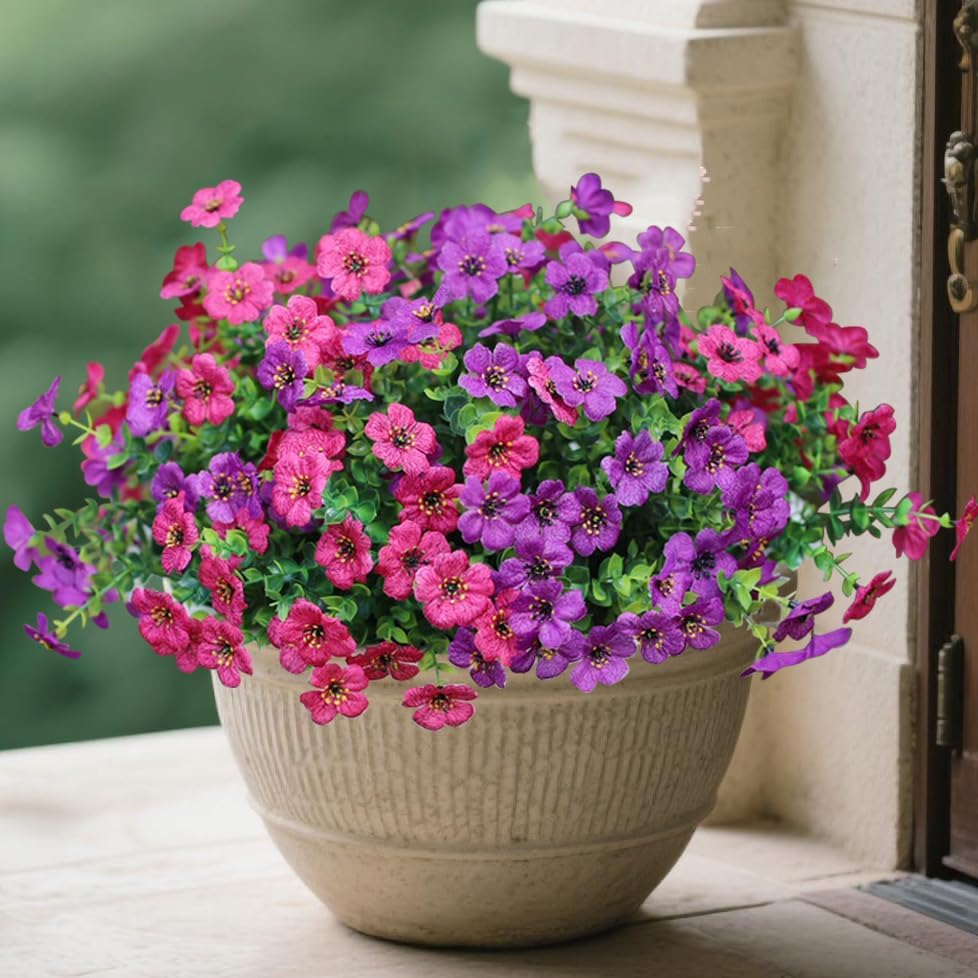 Artificial Flowers for Outdoors, Fake Faux Plants Outside Realistic Spring Summer Decor, UV Resistant Silk Flowers for Home Porch Garden (8, Purple Rose-red)