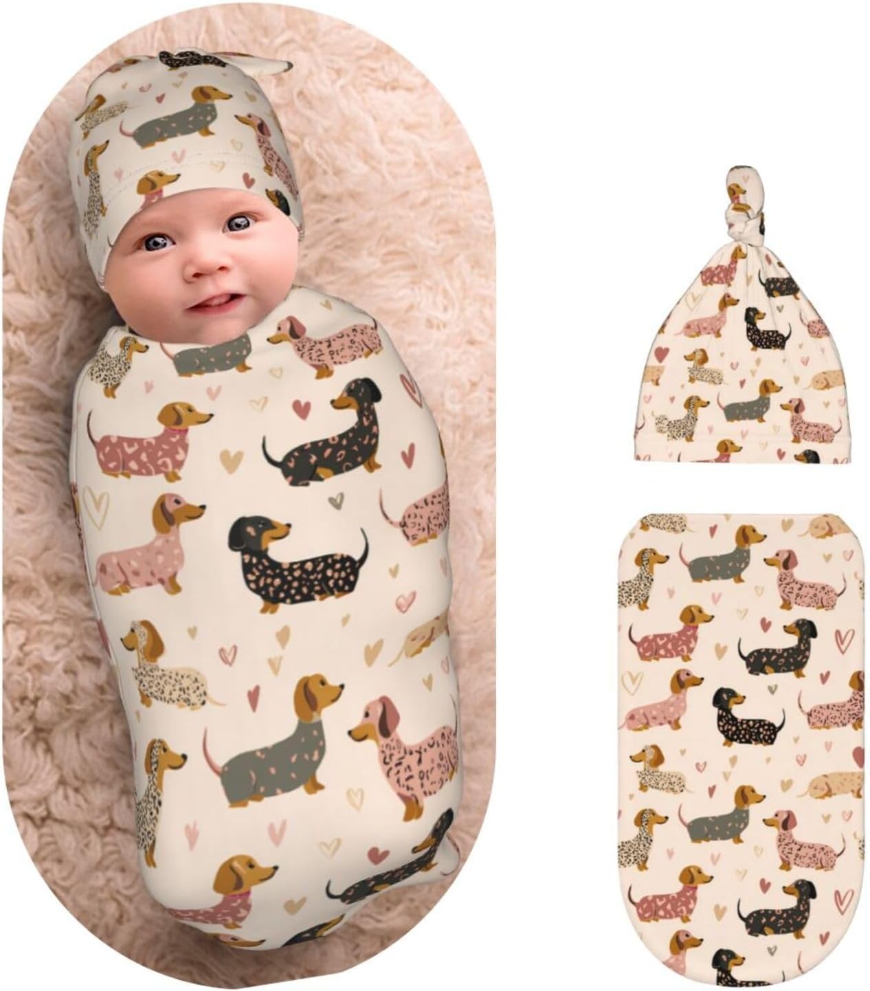 Cute Adorable Dachshund Dogs Newborns Beanie Swaddle Blanket Set Baby Receiving Blankets for 0-6m Infant Boy Girl Swaddle Blankets Wrap Soft Sleeping Sack