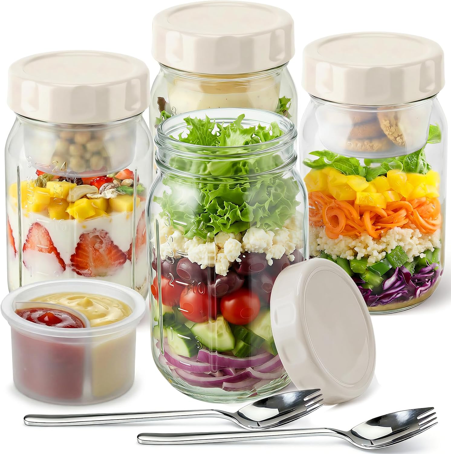 4 Pack Glass Salad Jars with Lids, 32oz Leakproof Glass Mason Jars for Salad & Meal Prep, Dressing Cup & 2 Forks, Leakproof Food Storage Containers for Lunch BPA Free & Reusable