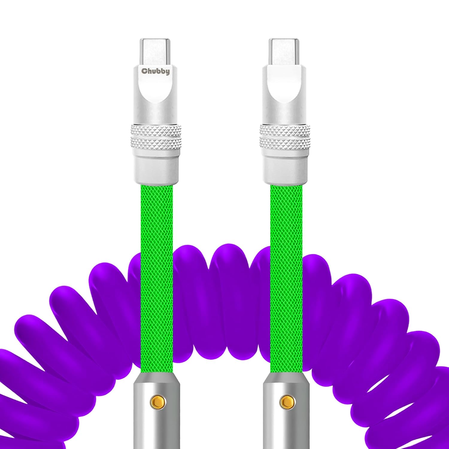 chubbycable Curly Colorblock Chubby 240W Coiled USB C Cable Braided Silicone Retractable Fast Charging Cable Compatible with iPhone 17-15 Series, Purple+Light Green, Type-C to Type-C, 2.29FT-3.6FT