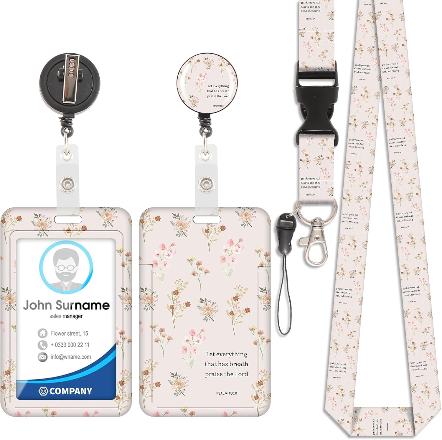 Badge Holder with Lanyard, ID Badge Holders with Retractable Badge Reel Carabiner Clip, Detachable Cute Lanyard, Personalized Vertical Card Cover Case Protector for Nurse Teacher Student(Bouquet)