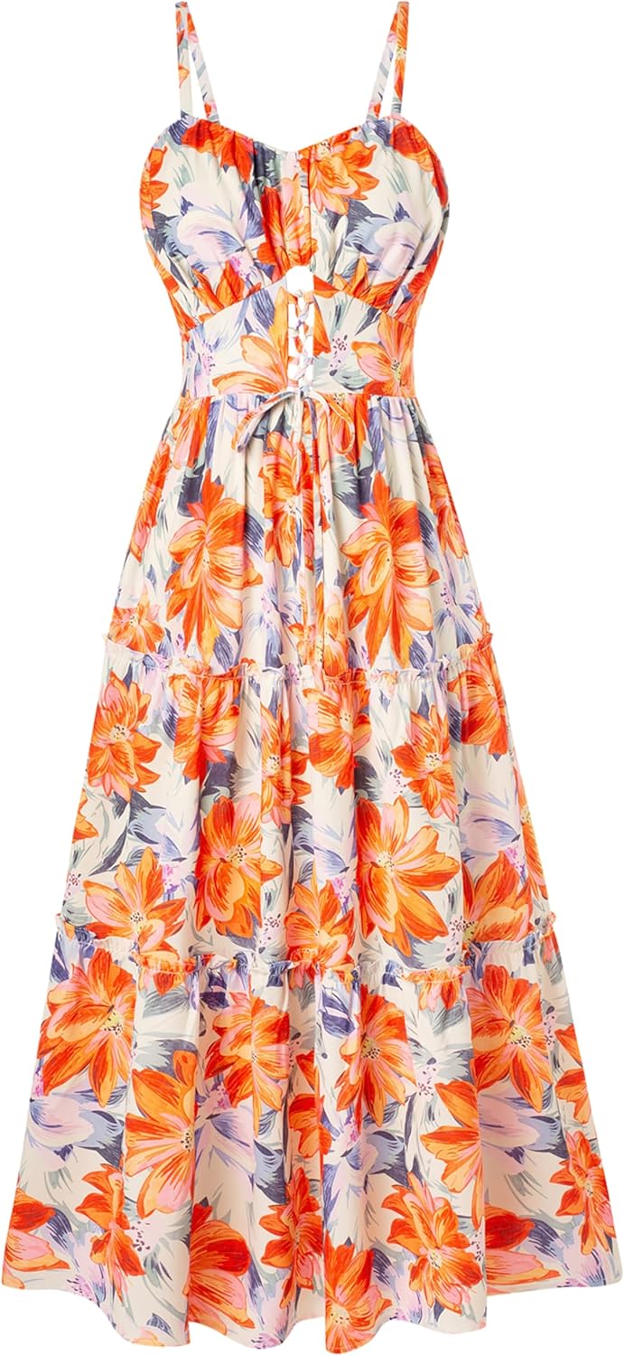 GRACE KARIN Women's Summer Floral Dress 2026 Boho Spaghetti Strap Smocked Tiered Casual Maxi Long Sundress with Pockets