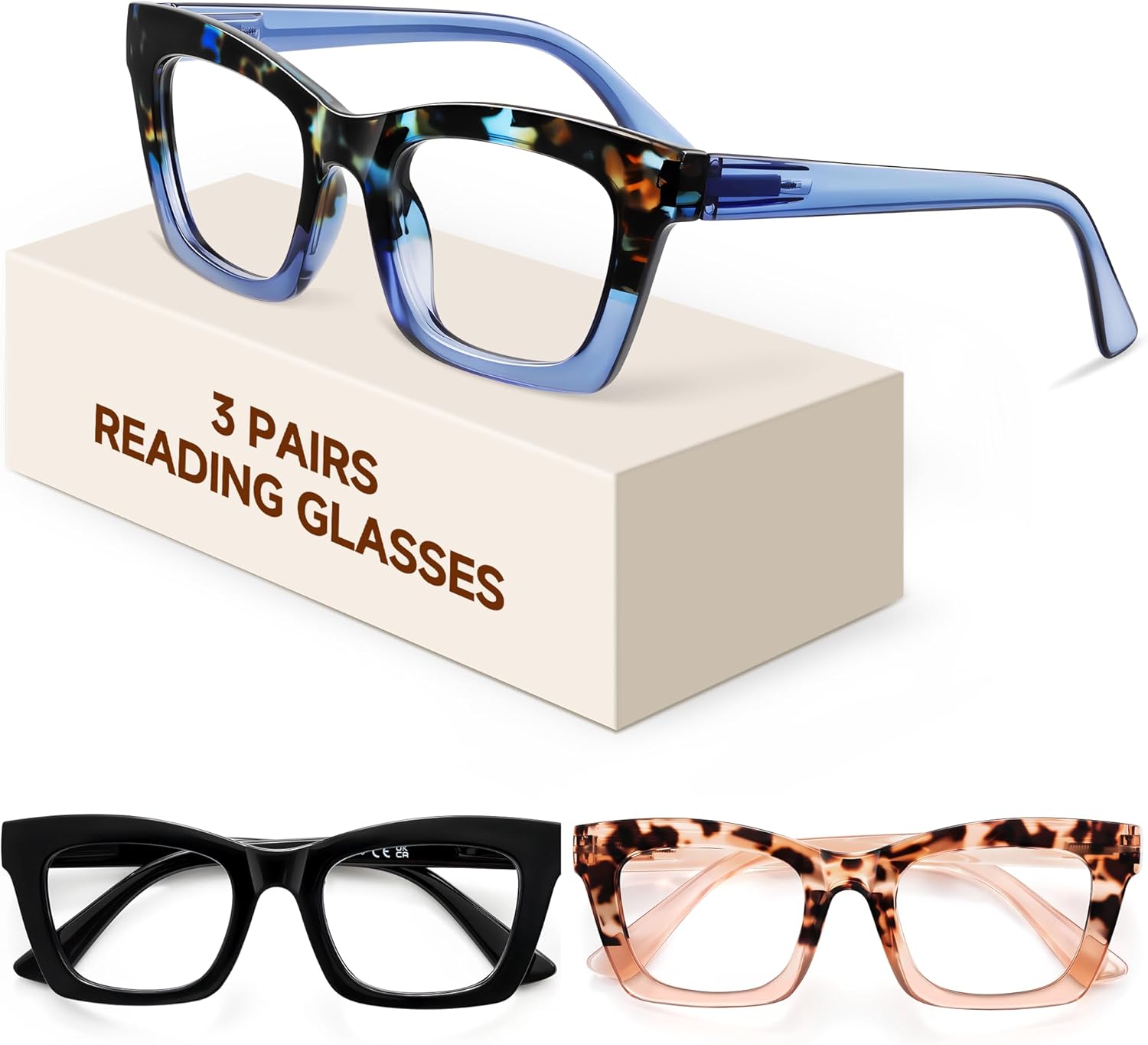 Oprah Reading Glasses for Women-3Pack Blue Light Blocking Fashion Readers with Spring Hinge Computer Square Eyeglasses