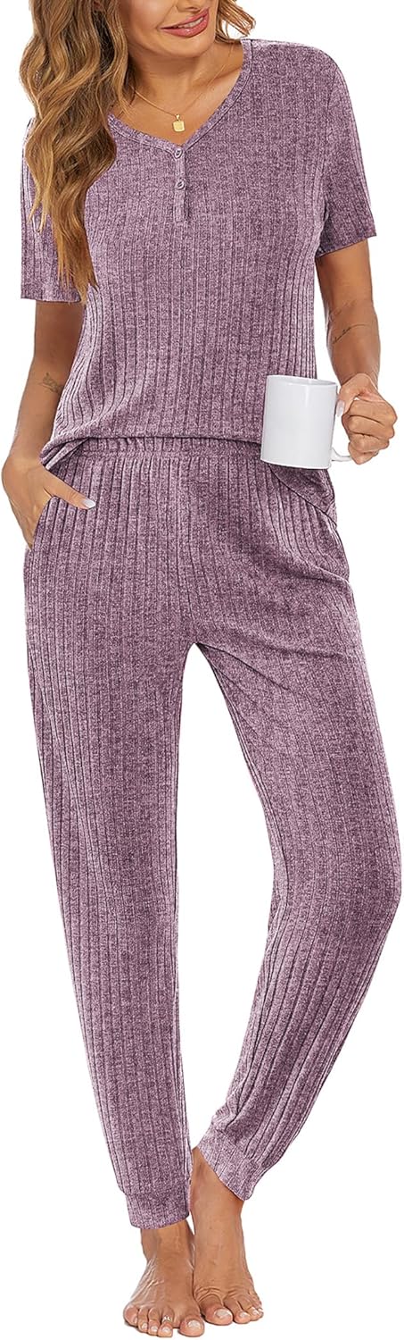 Ekouaer Pajamas for Women Set 2 Piece Rib Knit Lounge Set Joggers Loungewear Short Sleeve Pjs with Pockets