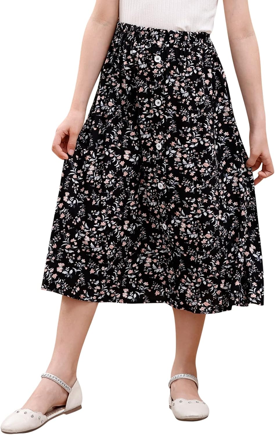 GORLYA Girls A-Line Elastic High Waist Pleated Swing Maxi Skirt with Pockets for 4-14T