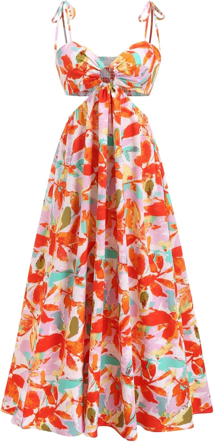 SOLY HUX Women's Floral Print Cut Out Dress Tie Shoulder Sleeveless Boho Vacation Long Flowy Dresses
