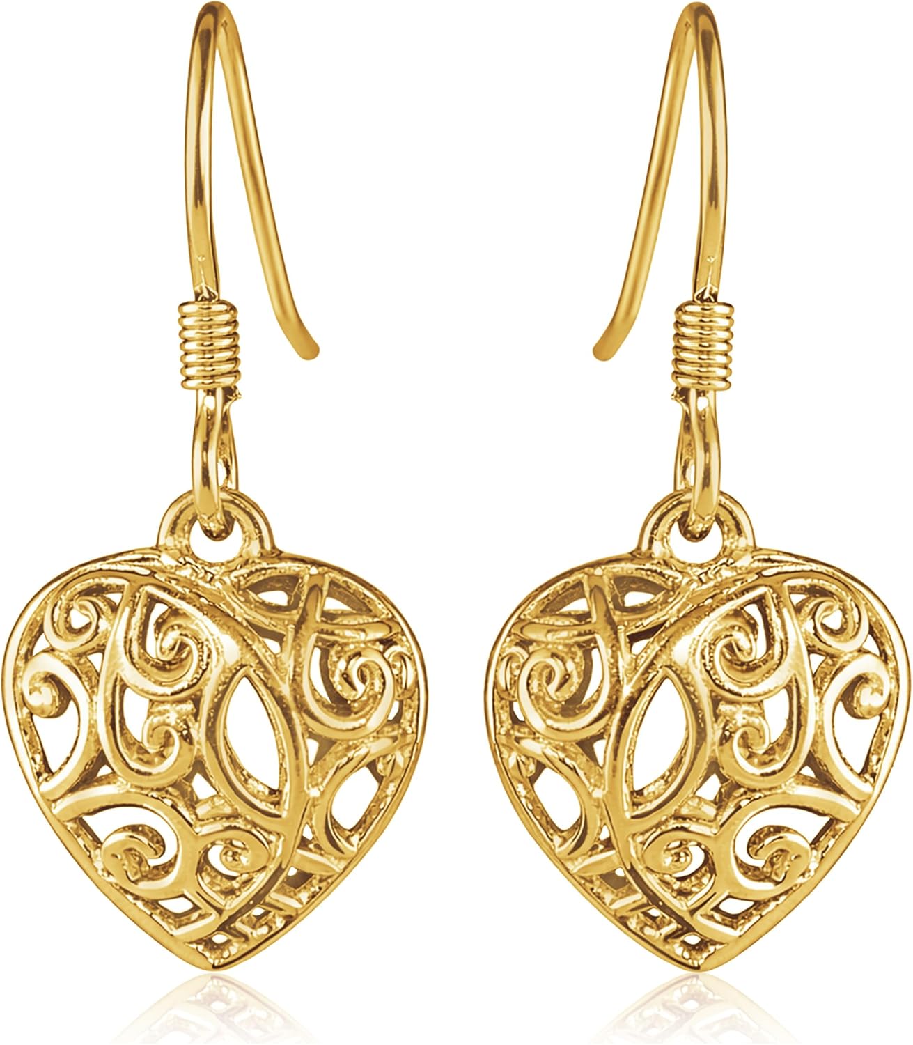 Filigree Heart Dangle Earrings - 14K Yellow Gold Plated 925 Sterling Silver Open Heart Drop Earrings - Openwork Dangling Earring Jewelry Birthday Valentines Day Gifts for Women
