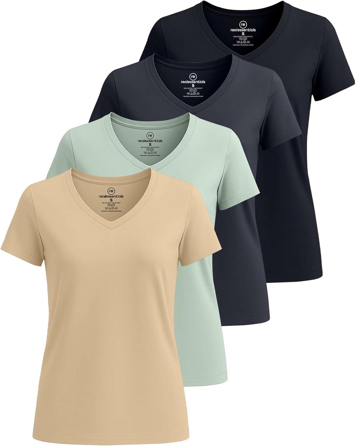 Real Essentials 4 Pack: Women's Classic-Fit Cotton Short-Sleeve V-Neck T-Shirt (Available in Plus Size)