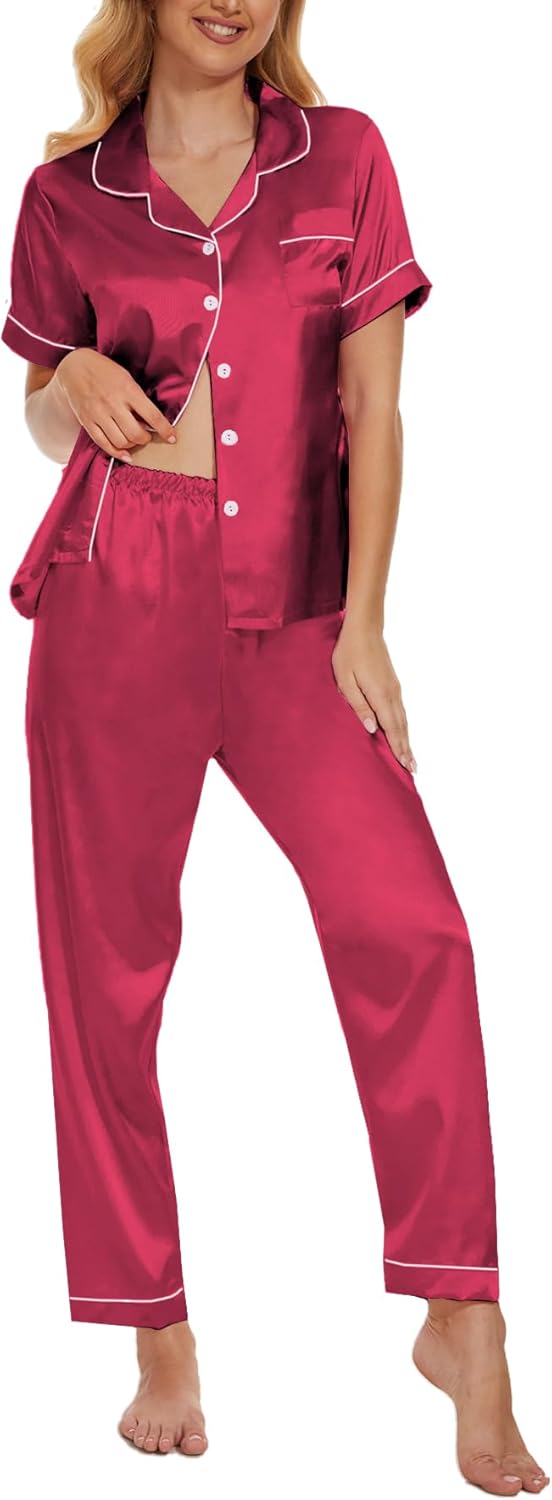 VENTELAN Womens Silk Satin Pajama Sets Short Sleeve Button Down Top and Long Pants 2 Piece Pjs Set Soft Sleepwear