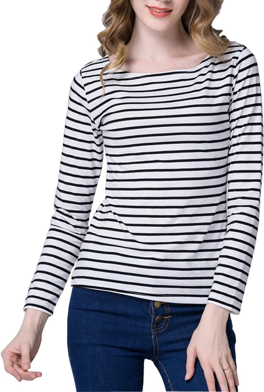 Tulucky Women's Casual Long Sleeve Shirts Stripe Tees Round Neck Tank Tops