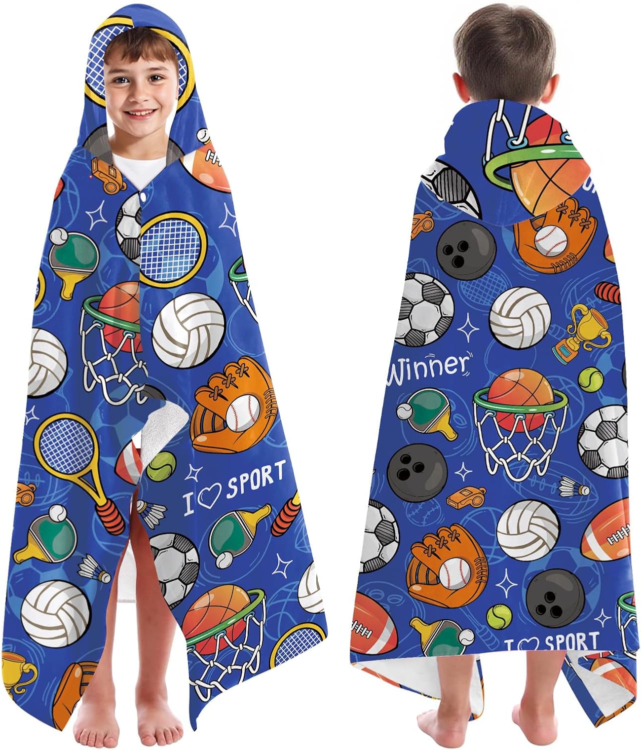 - SPORTS KIDS HOODED TOWEL: Featuring a fun blue design with vibrant ball games print, this towel brings excitement to bath time or beach trips. Its sport theme will appeal to both boys and girls, making drying off an enjoyable and playful experience
