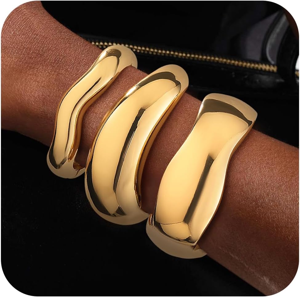 Honsny 2-3Pcs Chunky Gold Bangle Bracelets for Women Non Tarnish Stackable 14K Gold Plated Charm Cuff Bracelet Stack for Women Trendy Dainty Big Bangles Waterproof Jewelry Fashion Gifts