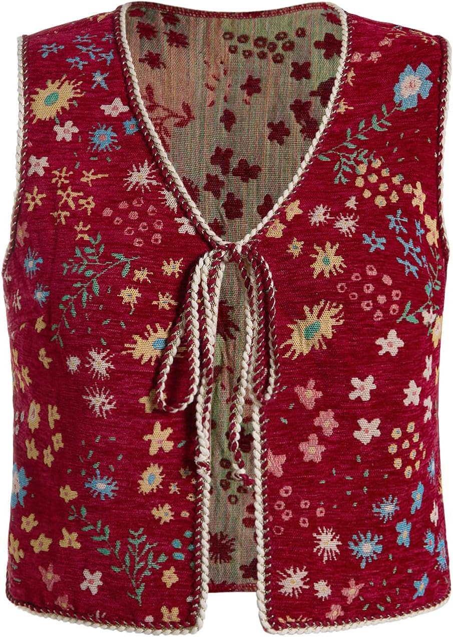 SweatyRocks Women's Floral Embroidered Tie Front Crop Vest Tops Boho Country Concert Cowgirl Western Outfits