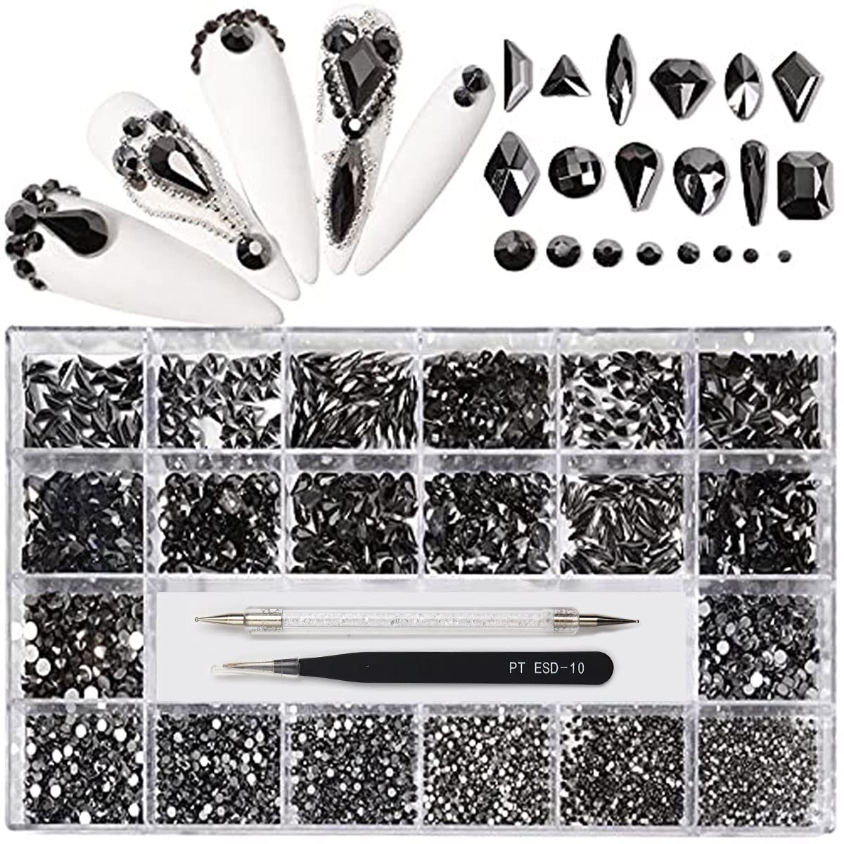 12 Types of Mine Black 600 Diamonds + 2500 Flat Rhinestones Mix 20 Styles Flatback DIY Crafts Rhinestone Crystals 3D Decorations Flat Back Stones Set +Tweezers + Drill Pen