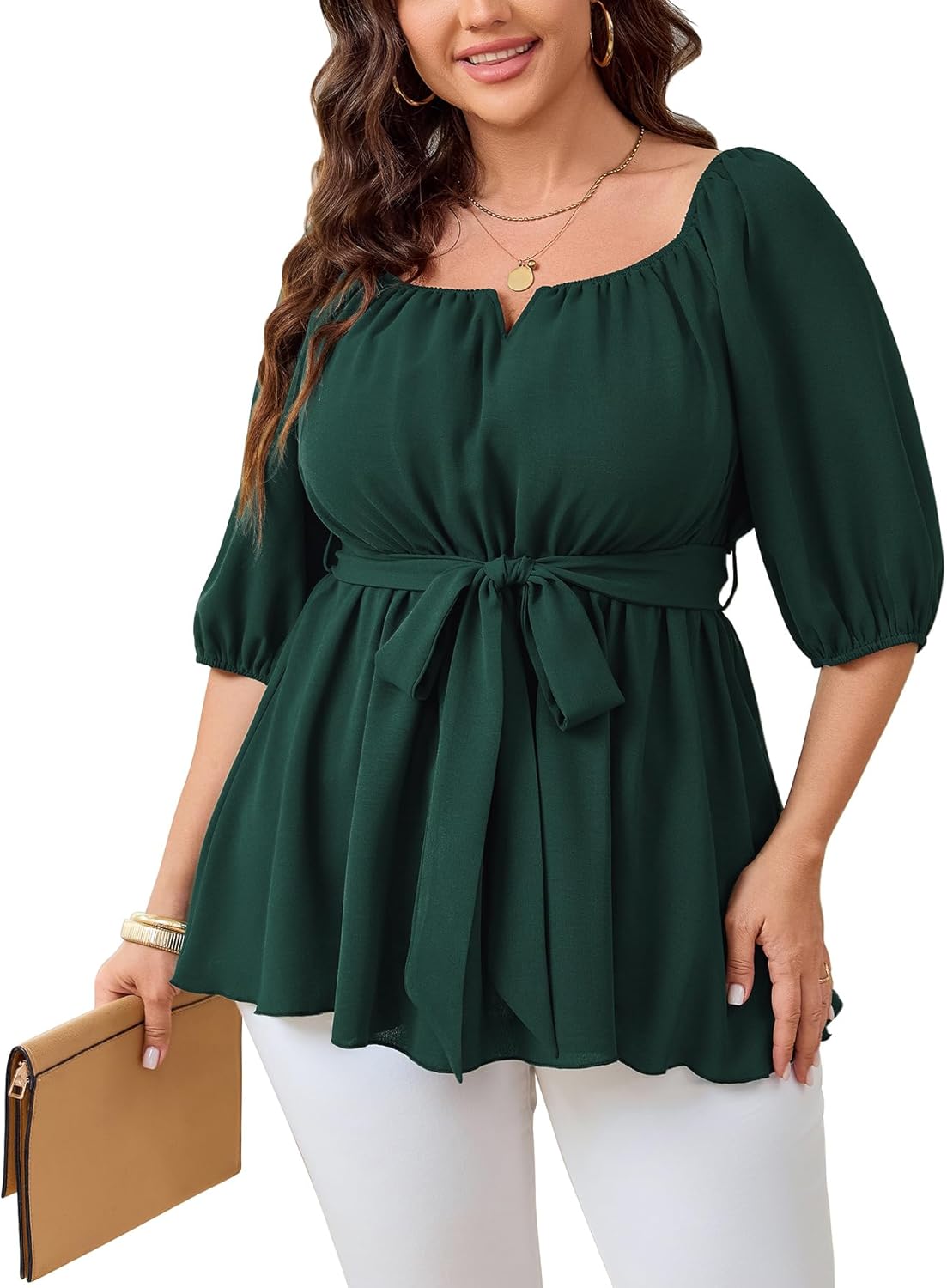 Women's Plus Size Square Neck Peplum Blouses Dressy Tops 3/4 Puff Sleeve Empire Waist Tie Ruffle Hem Babydoll Top