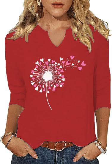 3/4 Sleeve V-Neck Shirts for Women Cute Love Heart Graphic Shirts Valentine's Tops Spring Day Blouse