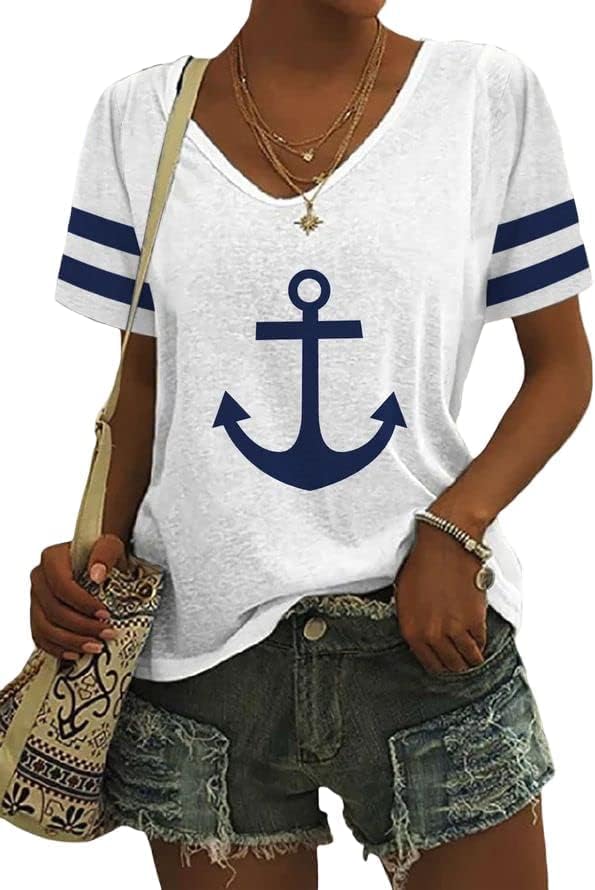 Womens Nautical Anchor Print T Shirt Casual Marine Sea Sailor Short Sleeve V Neck Top Blouse