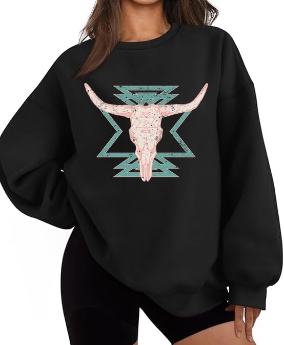 Oversized Western Cow Skull Sweatshirt for Women Vintage Casual Pullover Rodeo Graphic Country Concert Outfits Shirts