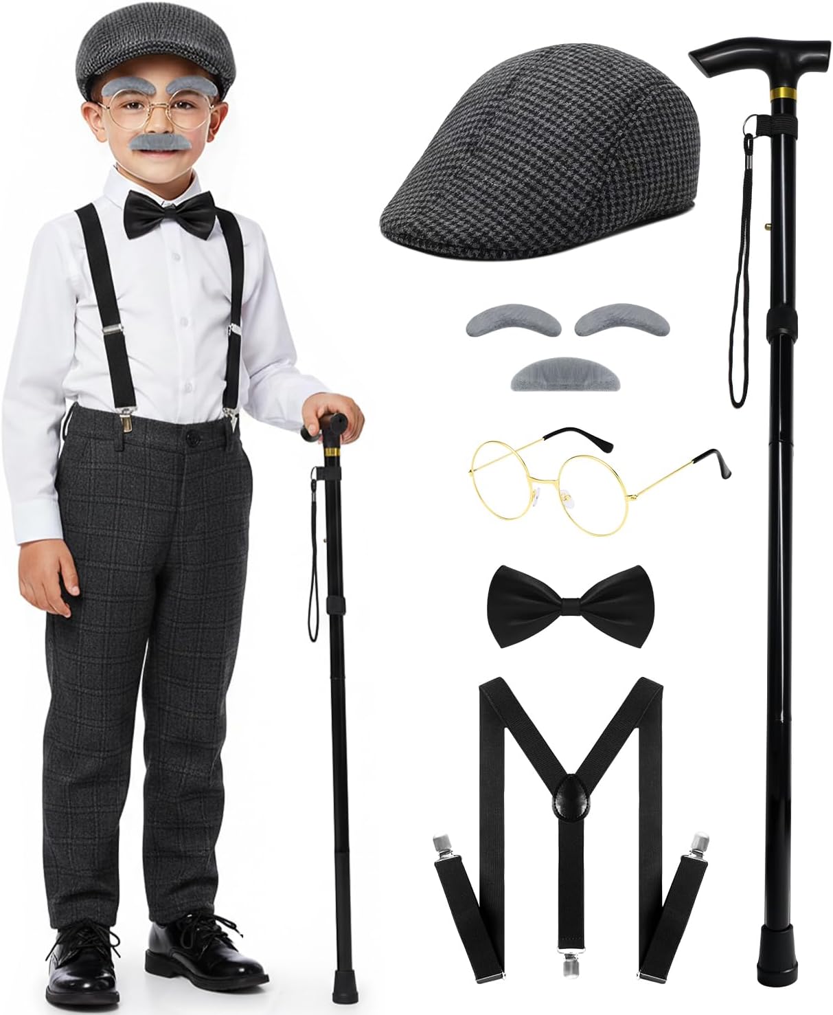 Old Man Costume for Kids–100 Days of School Costume with Hat,Glasses,Suspenders & Cane