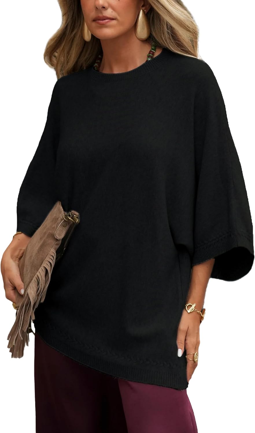 Tanming Womens Knit Sweater Crew Neck 3/4 Sleeve Oversized Tee Shirt Pullover Casual Loose Vest Tops(Black-XL)