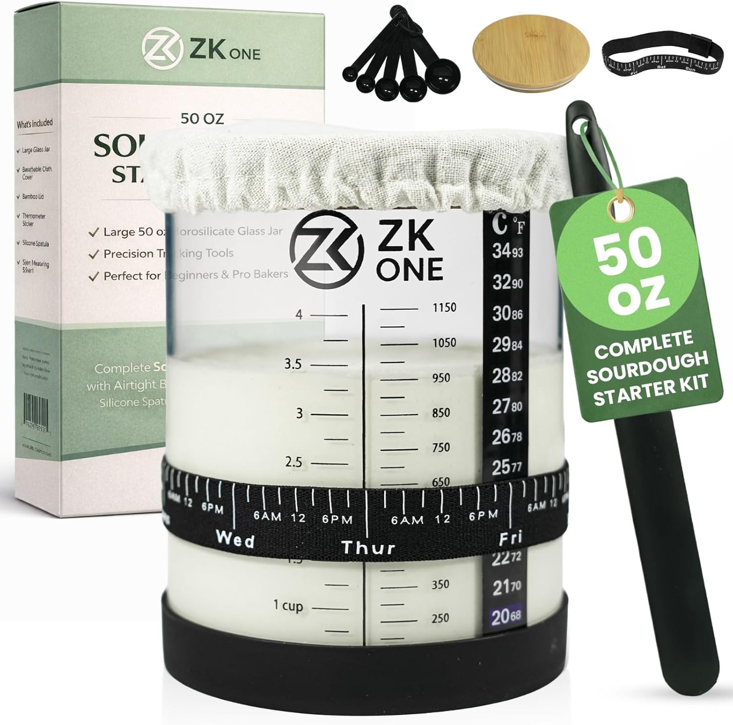 - ✅LARGE 50 OZ sourdough starter jar – Complete sour dough starter kits set featuring a durable 50 oz sourdough starter jar glass, bamboo lid, breathable cloth cover, silicone spatula, thermometer sticker, elastic band, and 5-in-1 measuring spoon set.