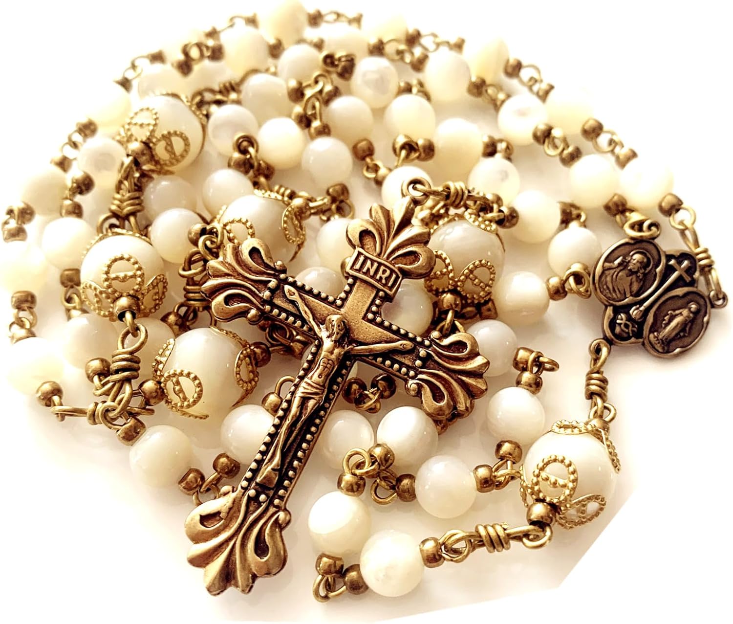 elegantmedical HANDMADE COPPER CATHOLIC ROSARY Moonlight Mother of Pearl Beads necklace Crucifix Cross gift box Gift
