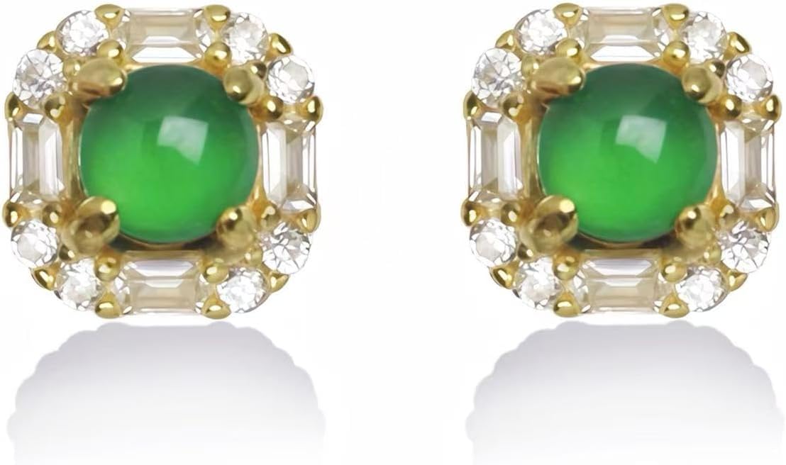 Jade Stud Earrings for Women Men 18K Gold Plated, Natural Certified Jadeite 4mm, S925 Silver Hypoallergenic Dainty Green Jade Studs Square Handmade Luxury Jewelry for Daily Use (2PCS Premium)