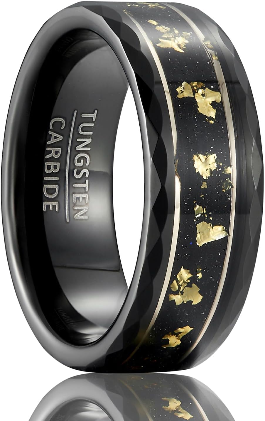 8mm Tungsten Wedding Band, Gallery Inlay with Gold Leaf on Sand Texture, Geometric Cut Sides