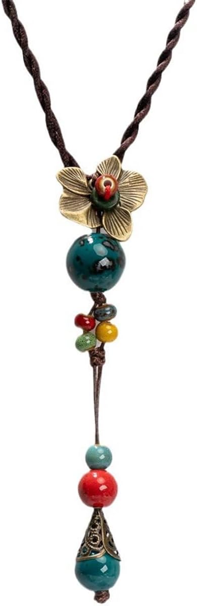 Hippie Boho Colorful Ceramic Round Beads Strand Necklace, Bohemian Long Bead Collar Necklace
