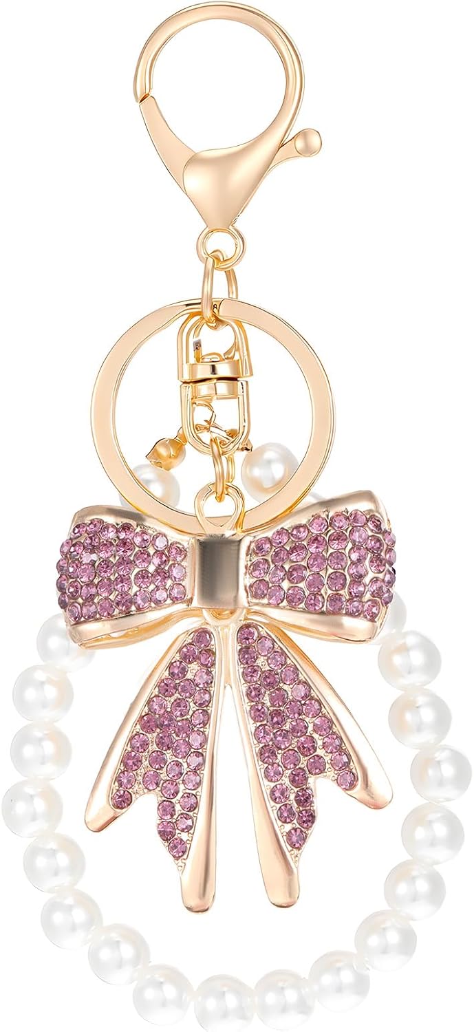 Bow Keychain Rhinestone Bowknot Keychain Purse Charms Bag Charms Imitation Pearl Chains for Handbags Purses Backpacks Aesthetic Cute Keychains Accessories for Women, Purple