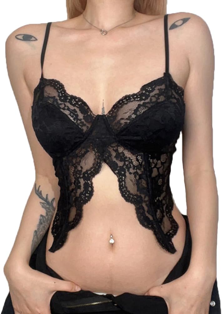 Women Sexy Full Lace Butterfly Crop Top See-through Slim Fit Spaghetti Straps Hot Y2K Camisole Rave Outfits Black