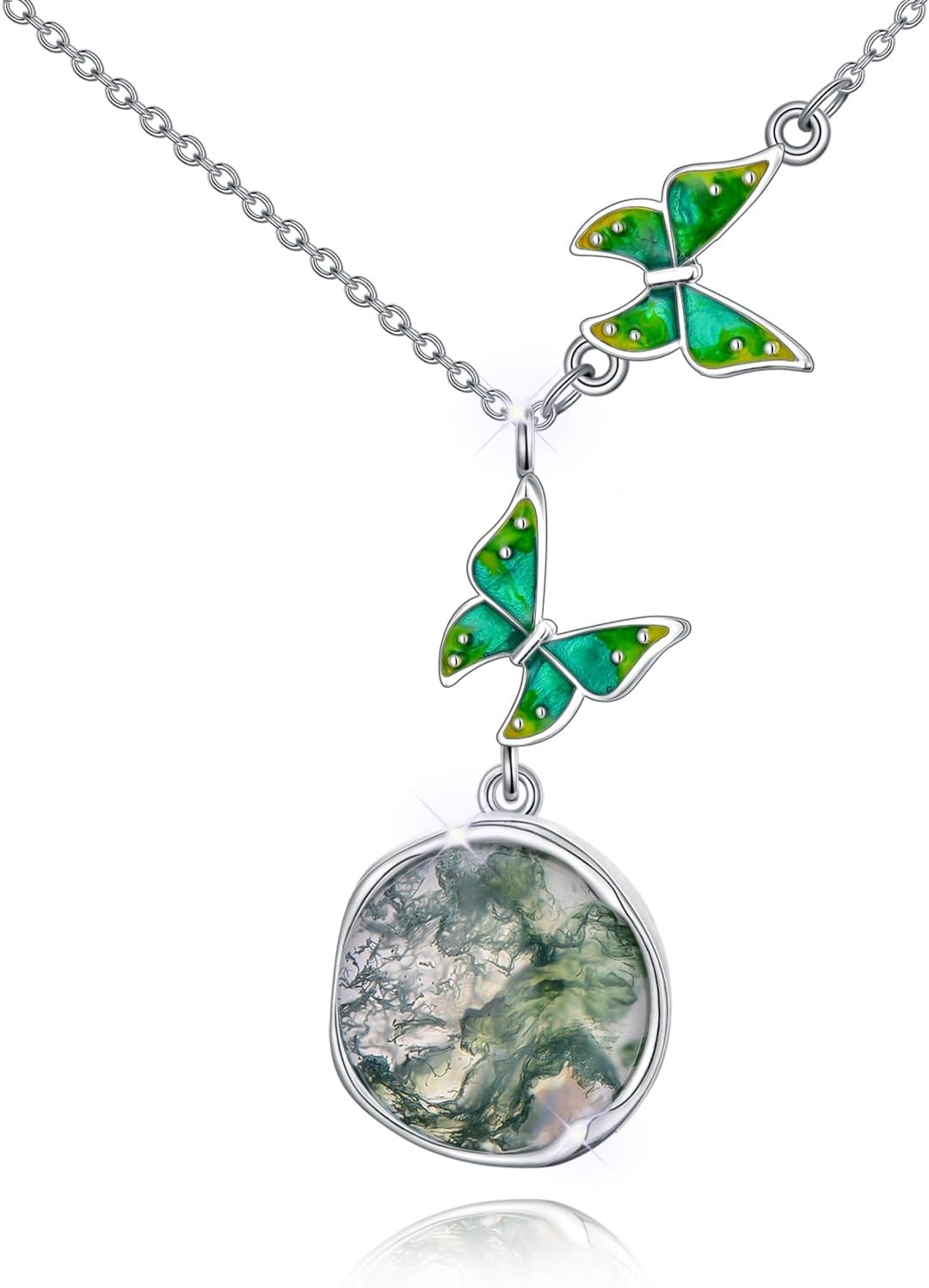 Butterfly Necklace Natural Moss Agate Necklace for Women Sterling Silver Butterfly Moss Agate Pendant Round Anniversary Birthday Mother's Day for Wife Mom