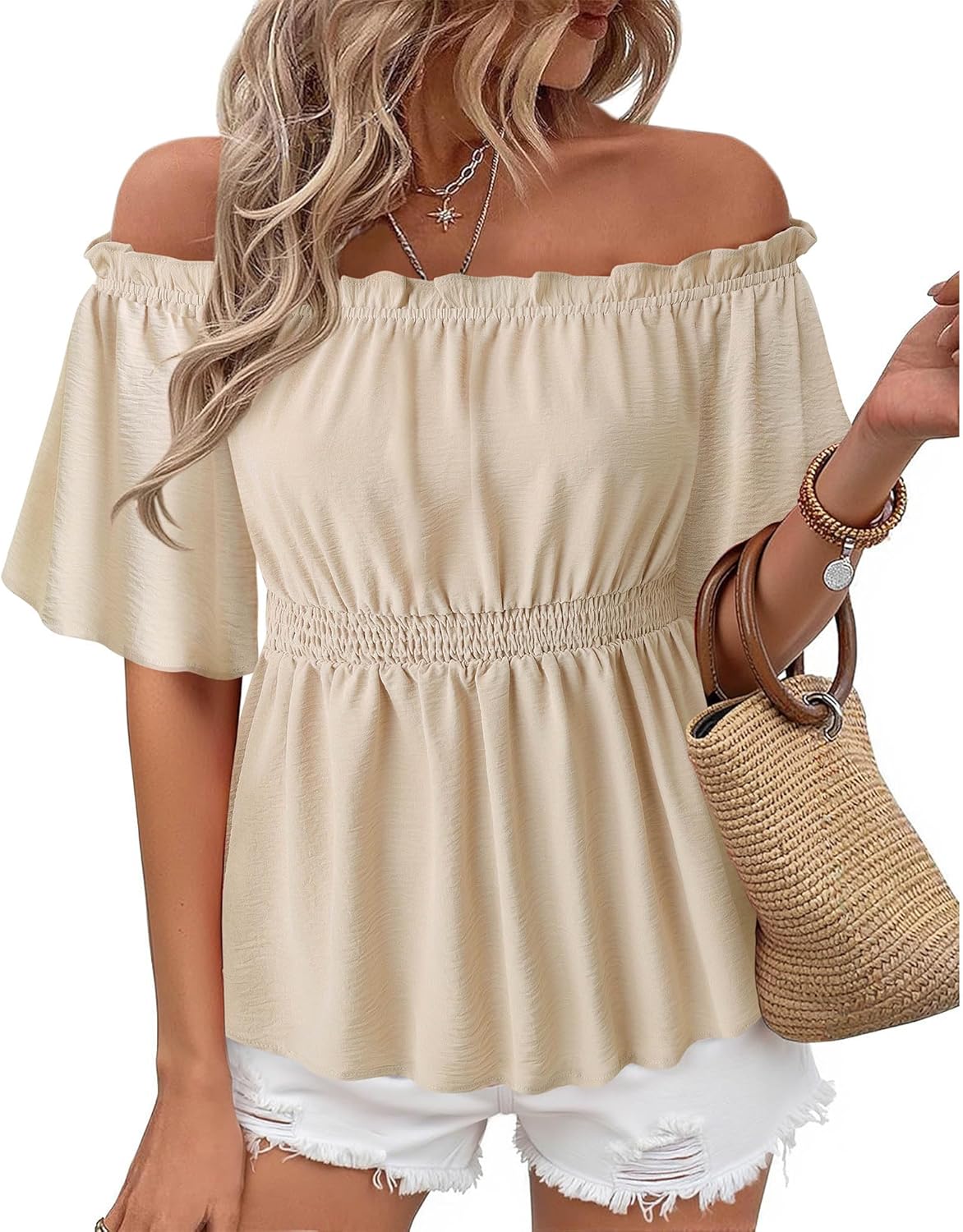 Bebonnie Women's Summer Sexy Off The Shoulder Peplum Tops Ruffle Sleeve Dressy Blouses