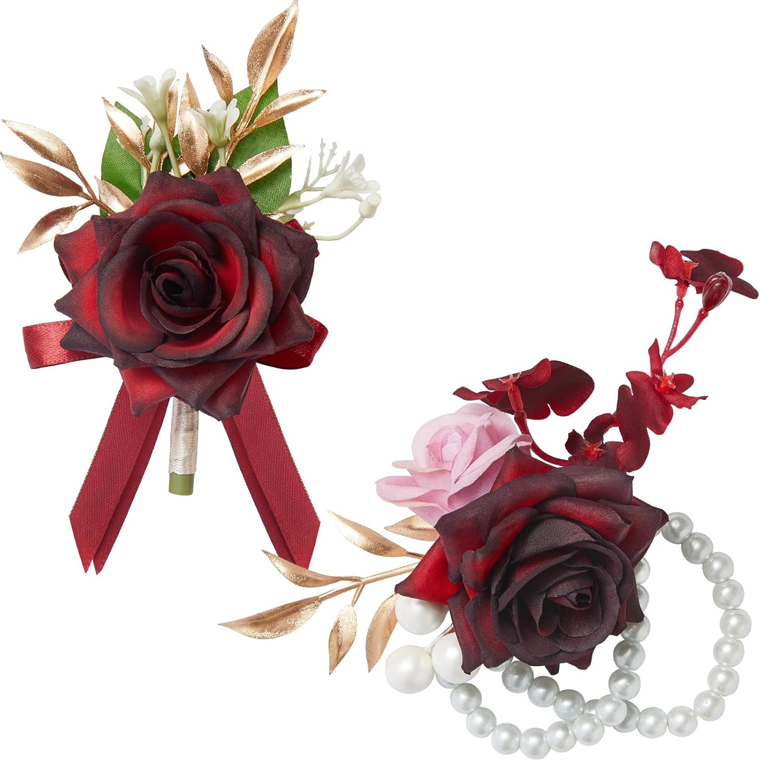 - Package Included:1 x Burgundy Rose Wrist Corsage for Bride,1 x Burgundy Rose Boutonniere for Bridegroom.