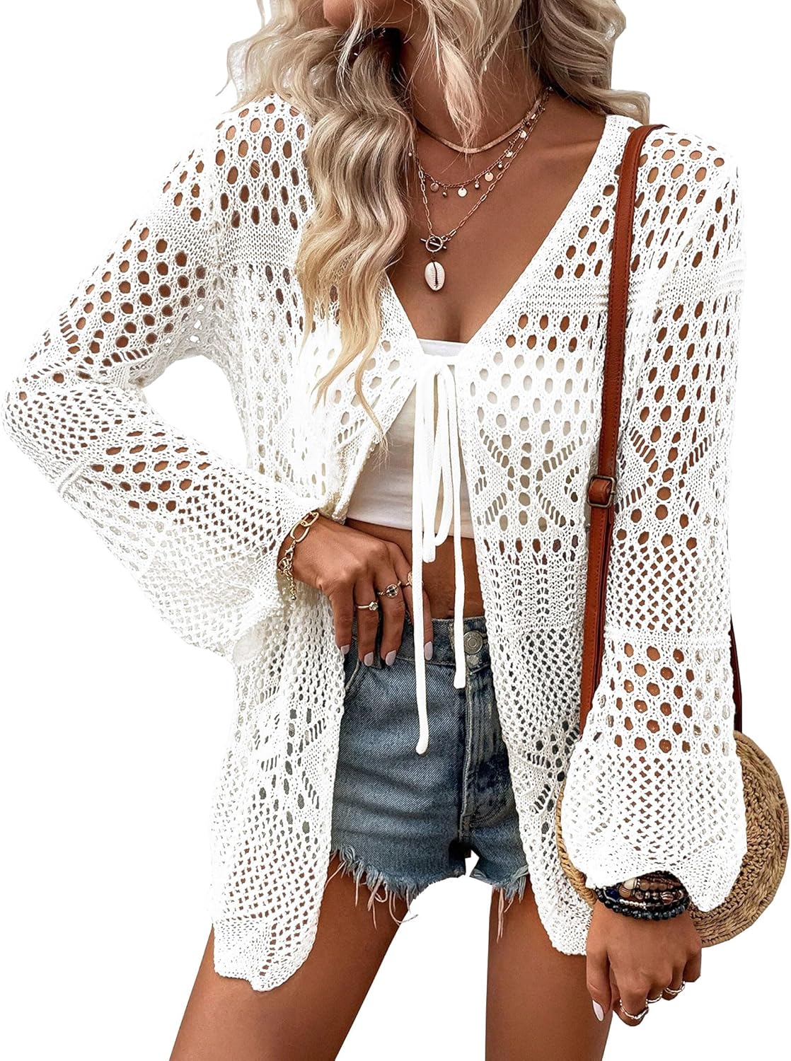 Women Crochet Cardigan Lightweight Tie Front Hollow Out Long Sleeves Summer Knit Cover Cardigans White