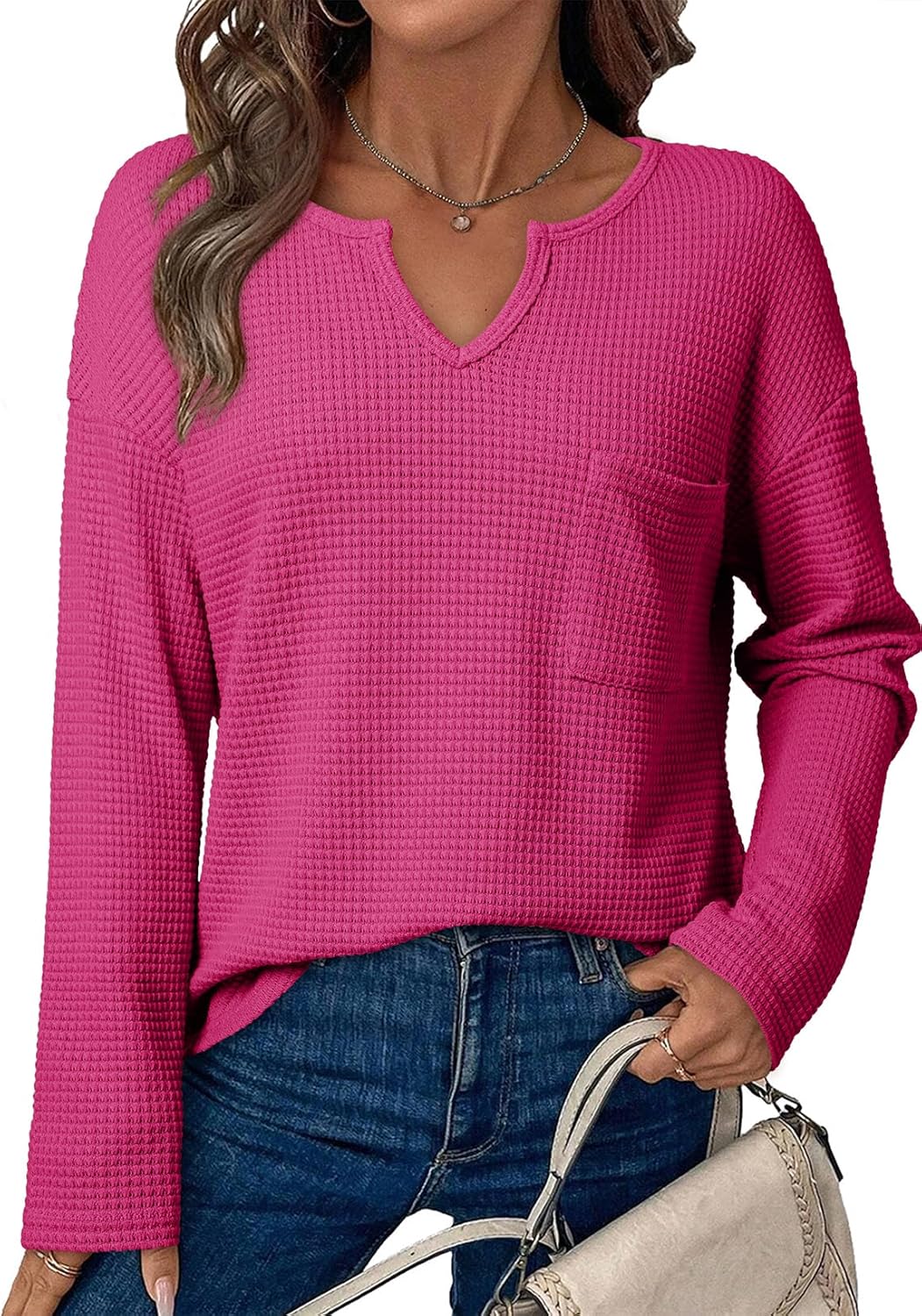 Dokotoo Womens Tops Waffle Knit Long Sleeve Notched V Neck Shirts Casual Trendy Solid Color Loose Blouses