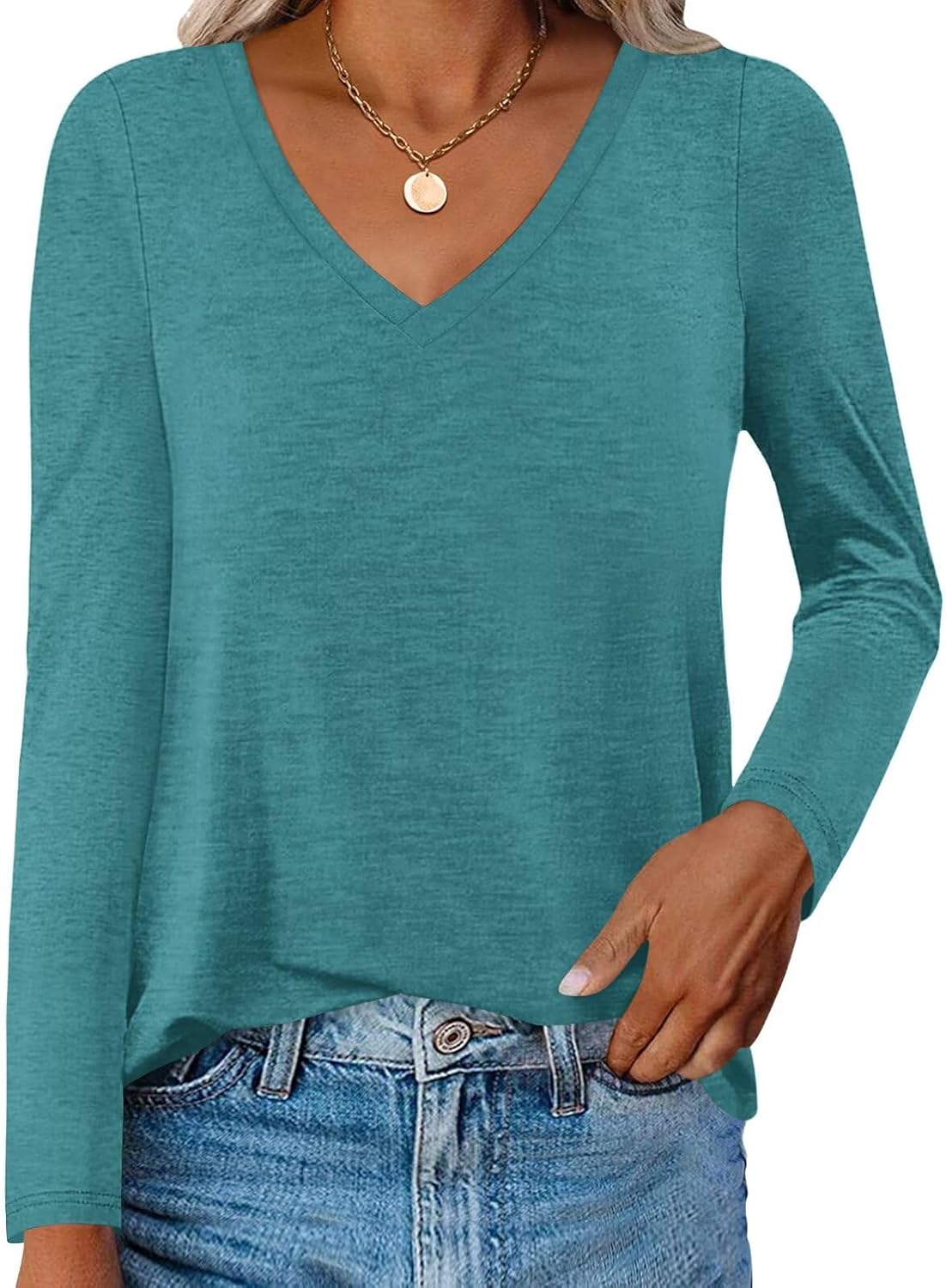 Womens V Neck Long Sleeve T Shirts Casual Curved Hem Tunic Tops Basic Loose Fit Tees 2026