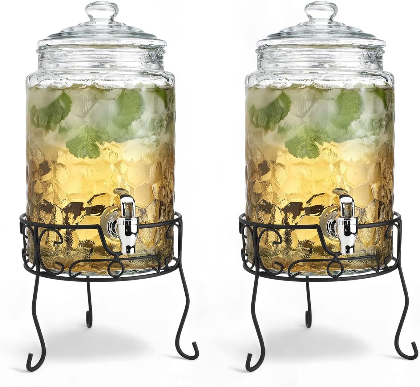2 PACK 1.5 Gallon Drink dispenser, Classic Hammered Glass Beverage Dispenser With Elegant Stand, Drink Dispensers for Parties With Spigot 100% Leakproof. Perfect For Parties And Daily Use