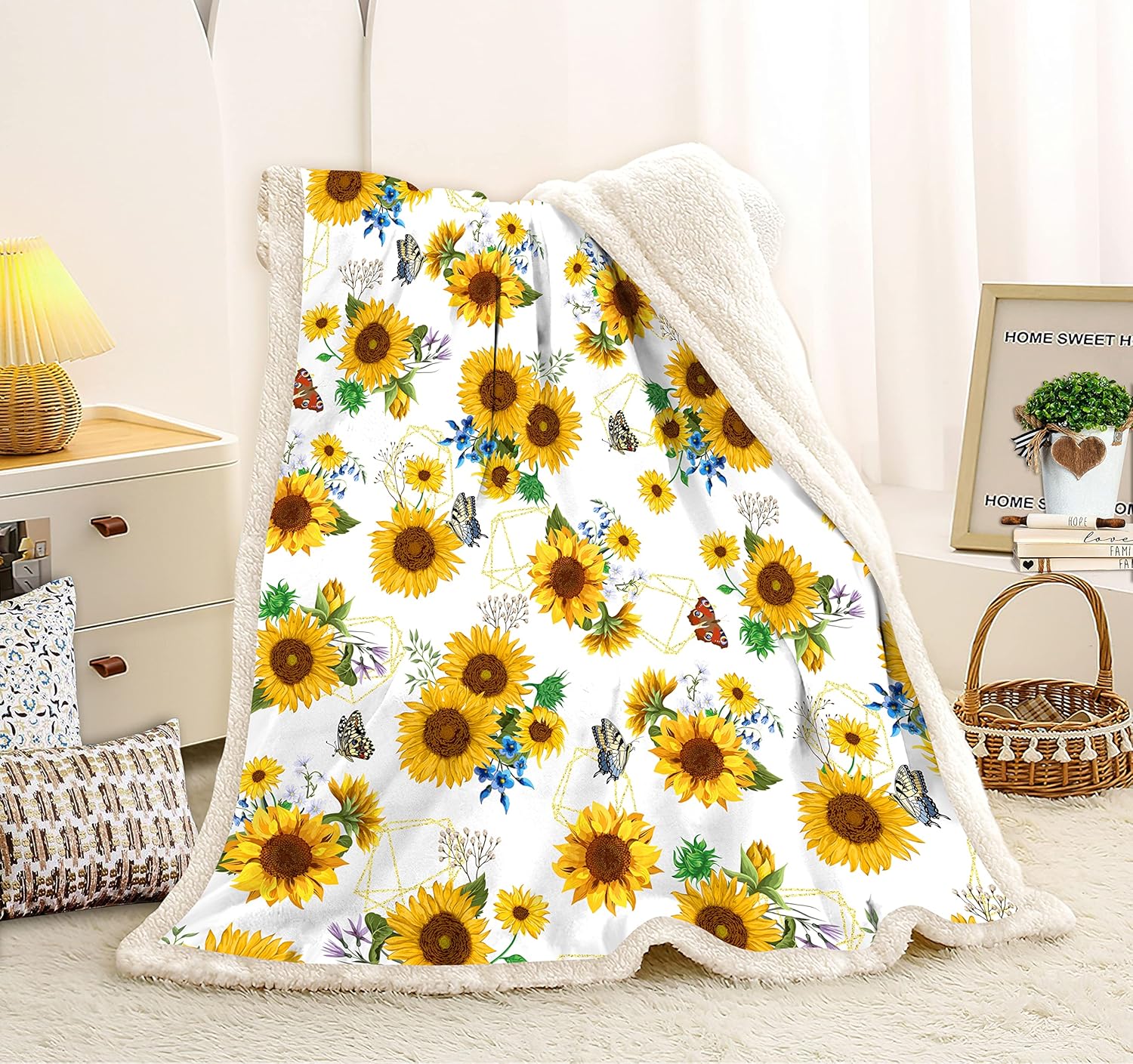 Sunflower Sherpa Throw Blanket - Soft Warm Dual-Sided Milk Fleece Floral Blanket for Couch Sofa Bed - Yellow Farmhouse Home Decor, Cozy Gifts for Women Mom Grandma, 50" x 60"