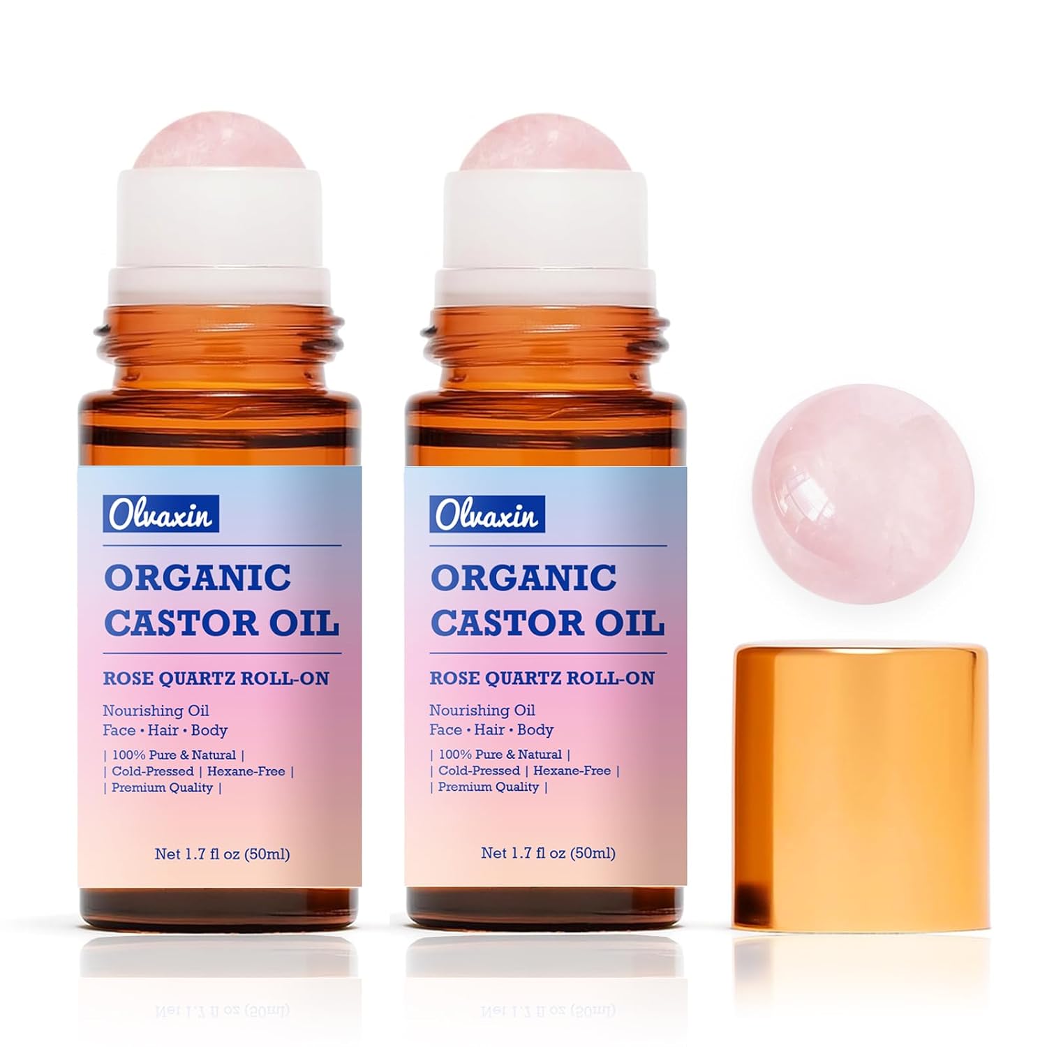 Organic Castor Oil Roll-On with Rose Quartz - 2 Pack x 1.7 fl oz(50mL) | Brown Glass Bottle, Cold Pressed, Hexane Free, Unrefined | Nourishing Oil for Face, Hair and Body